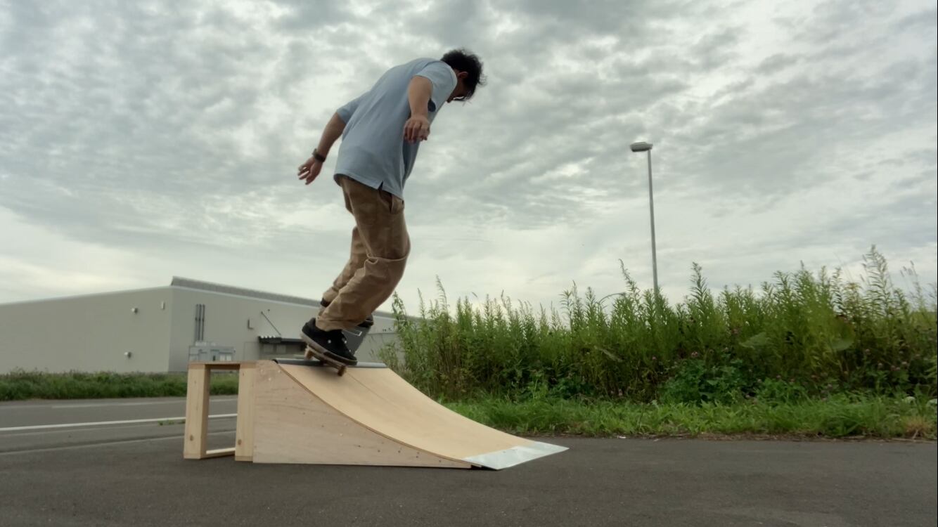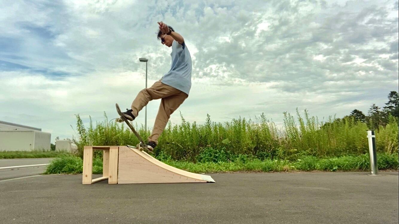 コーピングはエンビパイプ!金属ではないので恐怖心を減らせます。滑走面は5.2ミリ合板+3.7ミリ合板の2枚重ね。 その他材料は1×4.2×4材、一部胴縁を使用します。 インターフェイキーでも、デッキが落ちないプラットホーム。強度を確保した上で、簡単に作れる設計にしました。
